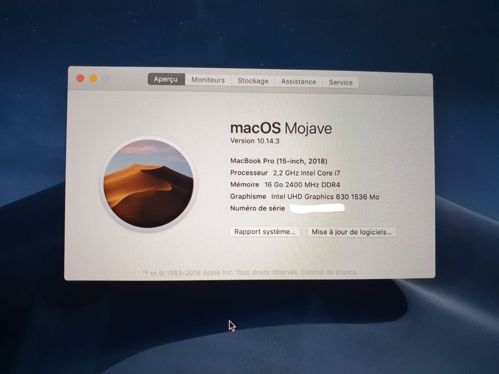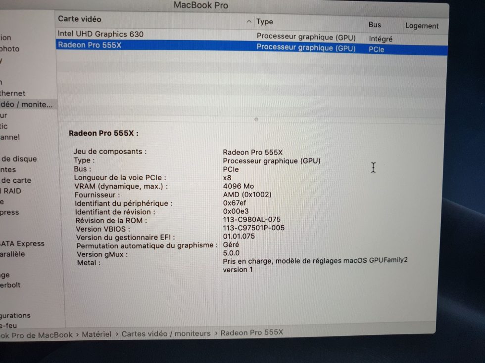Double carte graphique :Intel UHD Graphics 630 1536Mo & Radeon Pro 555x 4Gb dédié